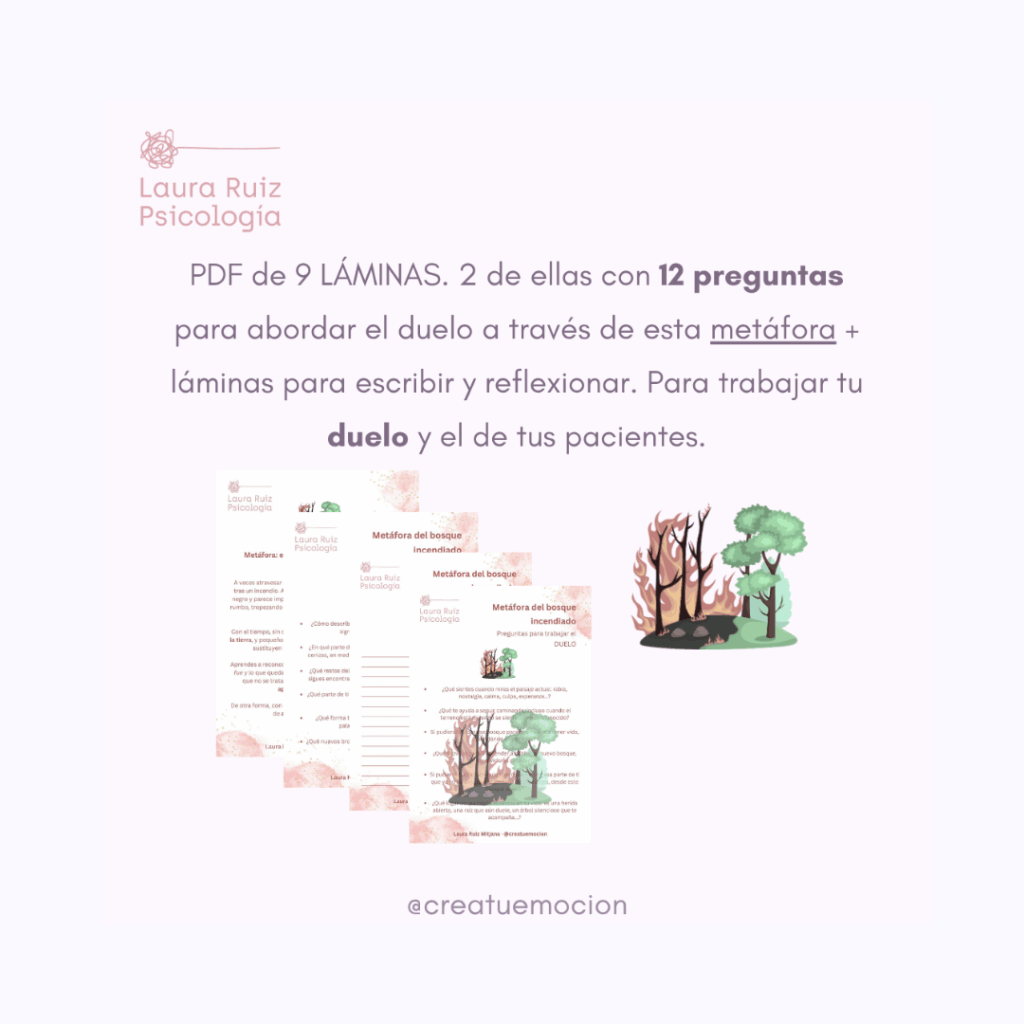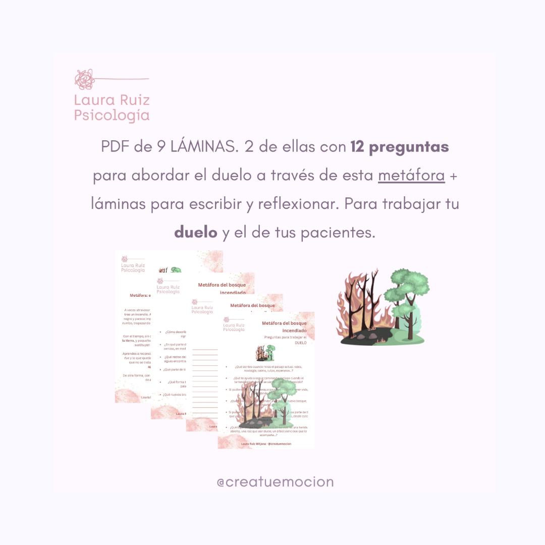 Material psicológico en PDF de 9 páginas: para trabajar el duelo a través de una metáfora original y profunda. Incluye 12 preguntas clave para reflexionar sobre el proceso de duelo + láminas con espacio para escribir.